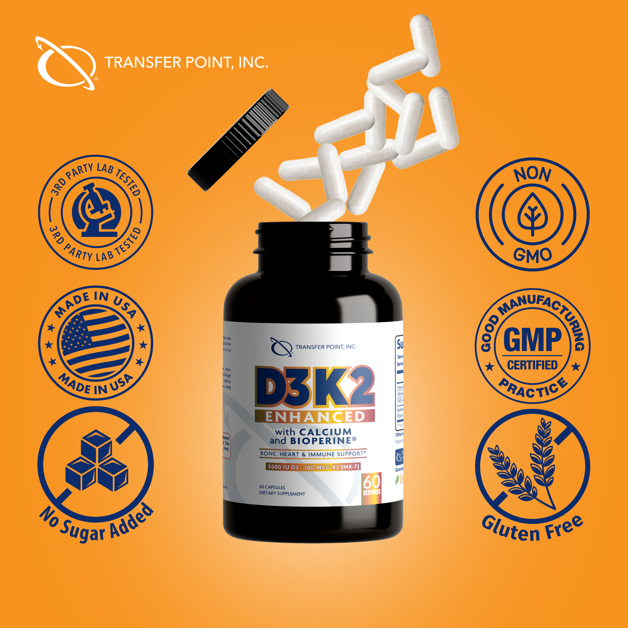 - PREMIUM QUALITY: Non-GMO, gluten-free, and manufactured and third-party tested in the USA in GMP-compliant facilities with global ingredients to rigorous quality standards. D3K2 Enhanced is a thoughtfully crafted formula from Transfer Point and the perfect combo for supporting daily wellness.